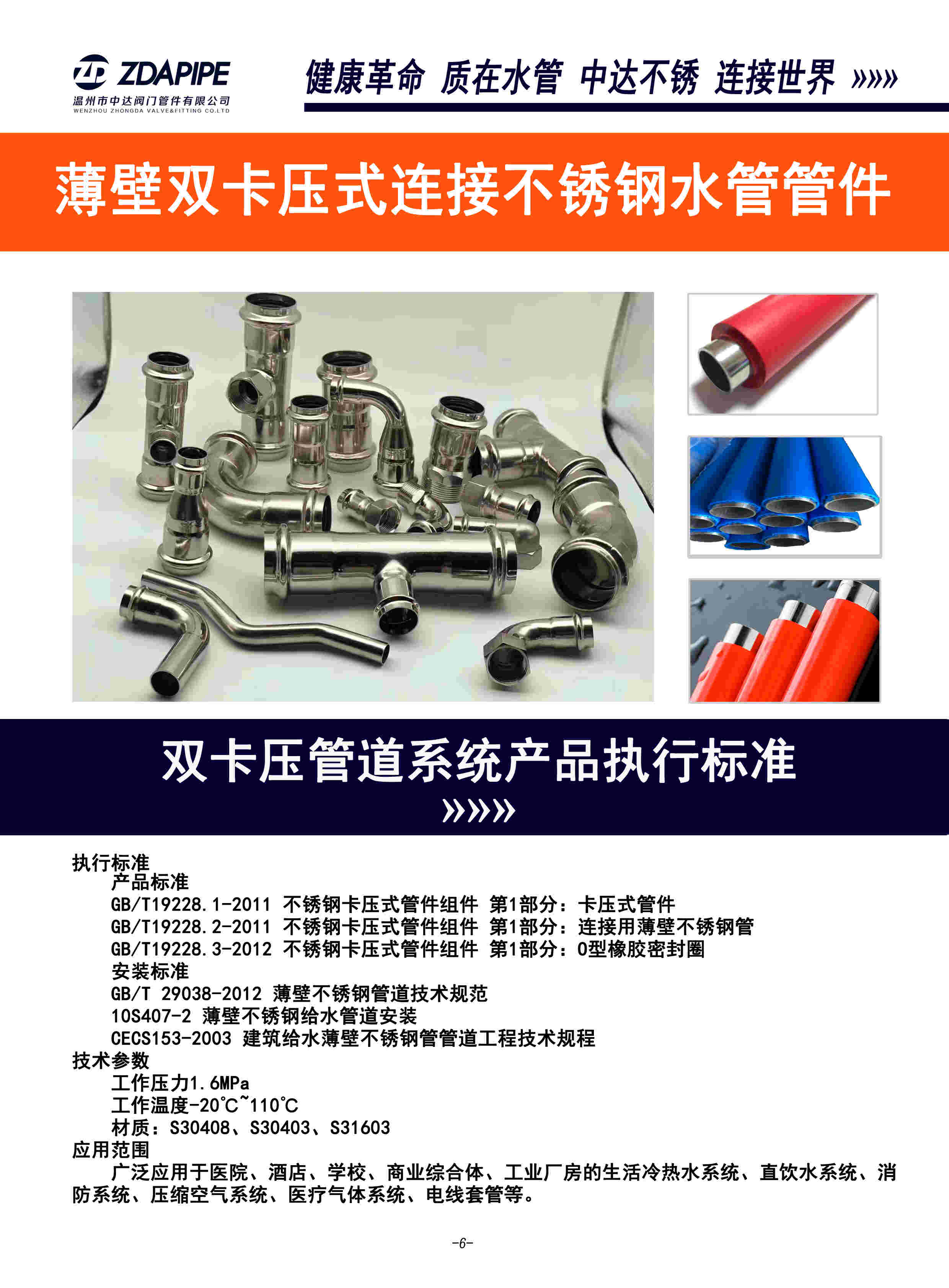 雙卡壓管件廣泛應(yīng)用于市政自來(lái)水管道工程,新建小區(qū)直飲水工程,工業(yè)與民用 建筑、賓館、公共建筑、睬氣供應(yīng)等分供水系統(tǒng)。給水,排水,二次供水,太陽(yáng)能,水務(wù)工程,自來(lái)水公司,醫(yī)院,學(xué)校,酒店,賓館,天然氣工程,自來(lái)水工程,直飲水工程,家裝水管工程,工業(yè)管道工程,水處理工程,清潔能源工程,綠色能源,核電等領(lǐng)域。健康革命,質(zhì)在水管,中達(dá)不銹,連接世界。